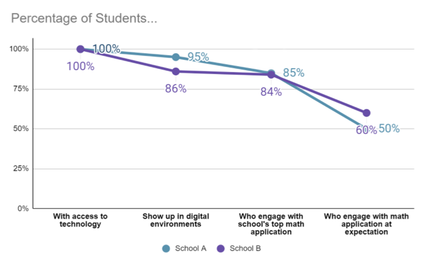 In the below example, we display digital engagement in two schools from one district. We present two schools, one with a high concentration of poverty and another with a low concentration of poverty. Each school uses a different math application. The math application in the high-poverty school focuses on rote memorization, while the one in the low-poverty school prioritizes conceptual understanding. As illustrated below, the low-poverty school (School A) had six times as many students who engage with the school’s most used math application as the high-poverty school (School B).